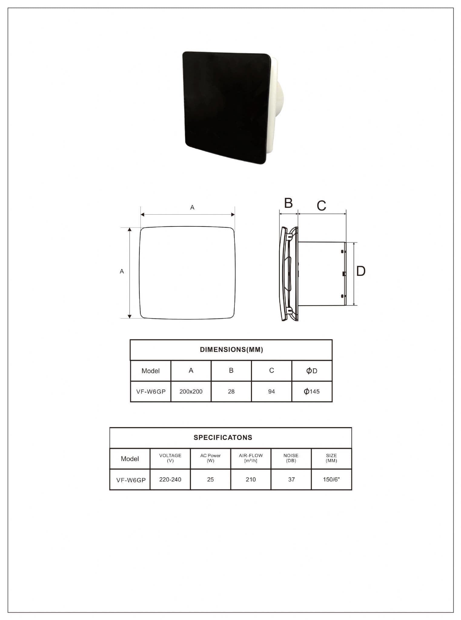 Bathroom Extractor Fan Matte Black Glass 150mm/6" with Timer VF-W6GP
