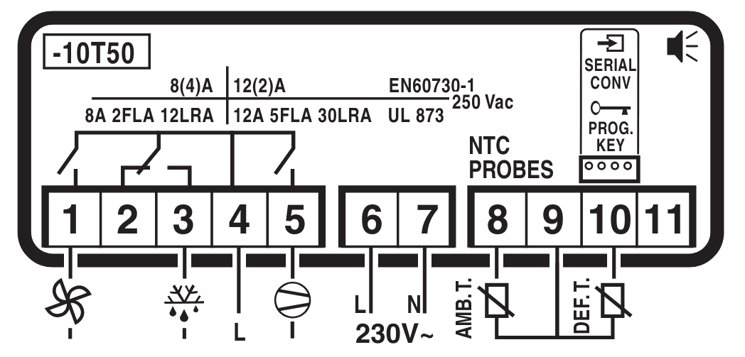 Temperature ventilated refrigeration -50/+90, 230v 50/60hz, c/w 2 ntc probe 3 relays, 12(5)a + 2 x 8(2)a. buzzer screw terminals (12a). pre-programmed