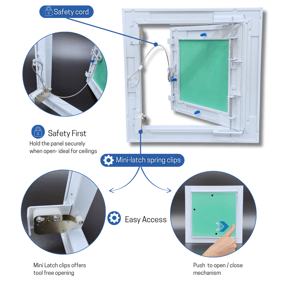 - Safety features: Safety cord secures the detachable door to the frame, to prevent risk of falling objects when opening the panel (especially in ceiling applications).