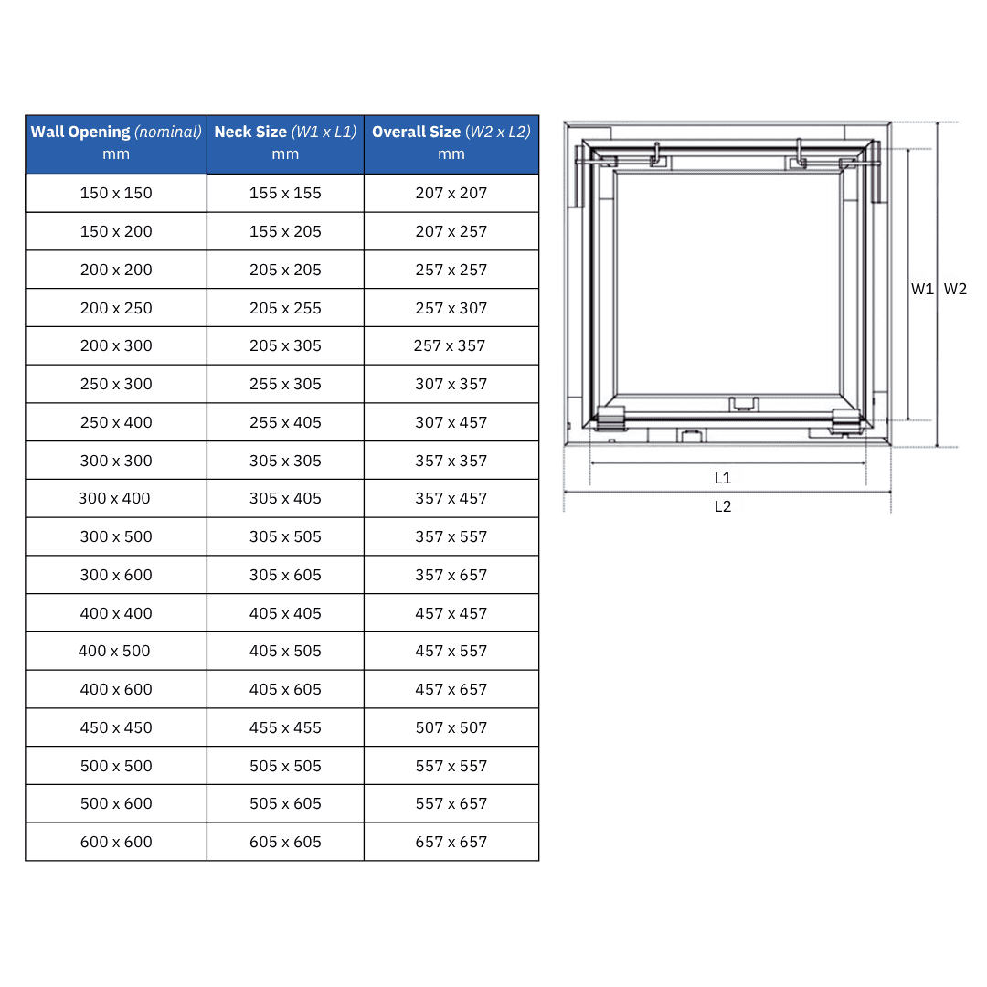 Note: The sizes listed are defined as "Opening Size". This is the size of opening that is available for access once the panel is installed.