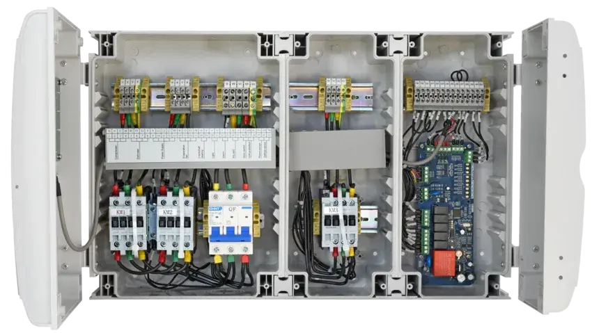 Modern Hermetic Enclosure IP65: The hermetic casing not only ensures high safety standards but also reduces installation costs and time, combining the controller and switchgear with DIN rail protection.