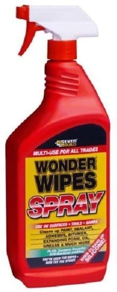 The liquid in this Wonder Wipes Spray bottle is exactly the same as that which our Multi-Use Wonder Wipes are soaked in, so you can be assured of the same renowned cleaning power you get from the Nation’s No.1 Builders Wipe. It can be used to clean up wet and semi-cured paints, sealants, adhesives, bitumen’s, polyurethanes, expanding foams, polyester fillers and epoxies from tools, surfaces and hands.