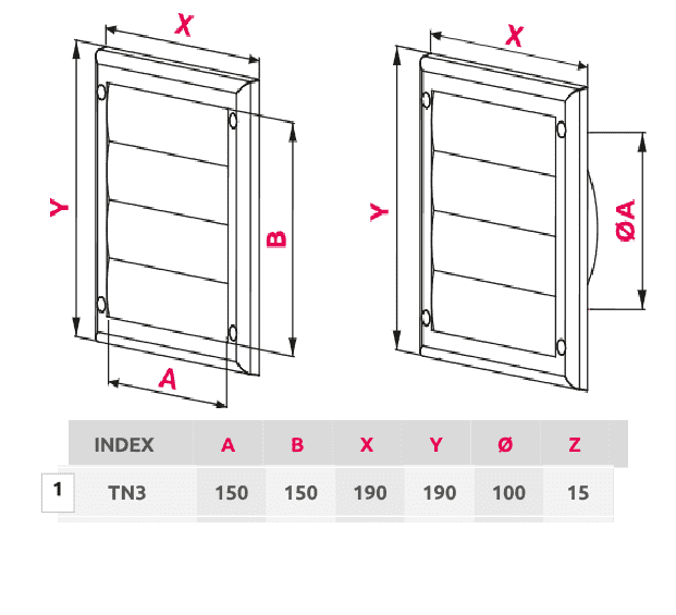 Ventilation grilles are used to terminate ventilation ducts. The grilles in the Exclusive series come without a flange (except for the round connections) and feature a modern design. The grilles in the TN series are fitted with a louvre to permit air flow in one direction only.