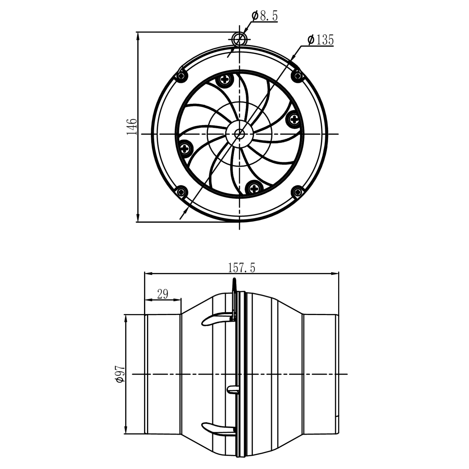 🔧 Quick Hook Installation: Lightweight 0.6 kg unit hangs easily using a rope or hook; duct connection size Ø97 mm, body diameter 135 mm, total length 157.5 mm.
