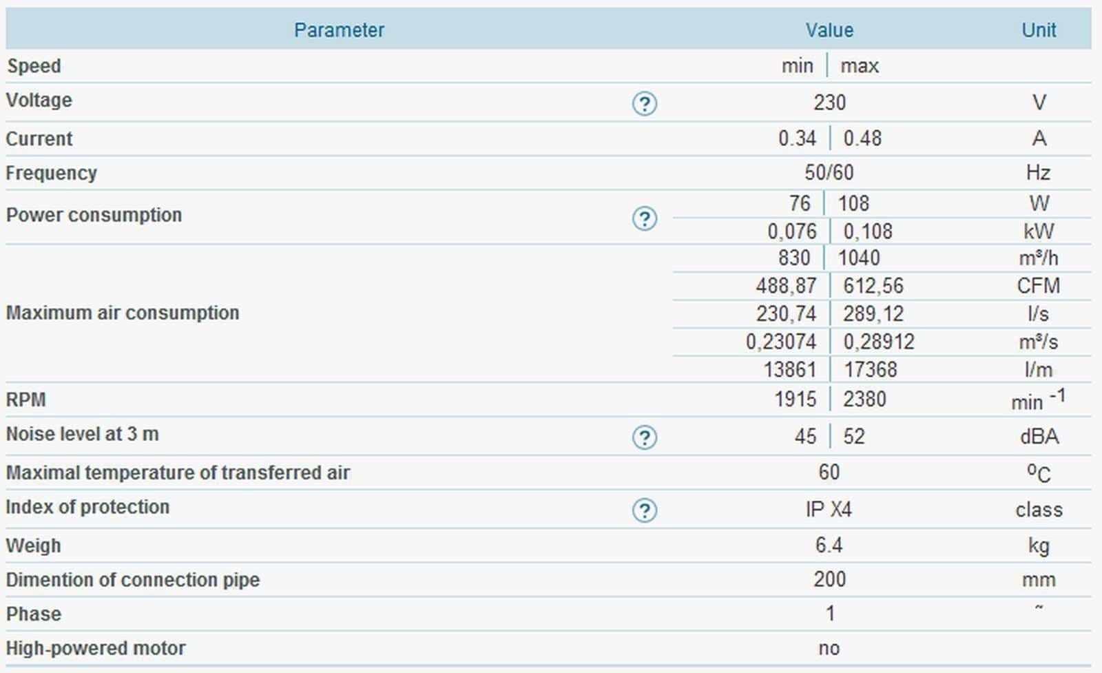 | 200mm 8" | 230 | 50/60 | 108 | 2380 | 52 dBA |