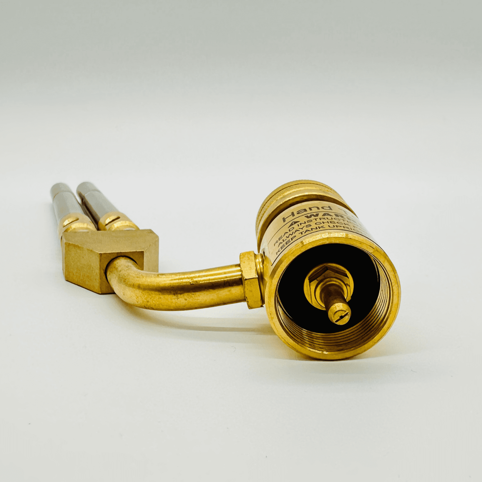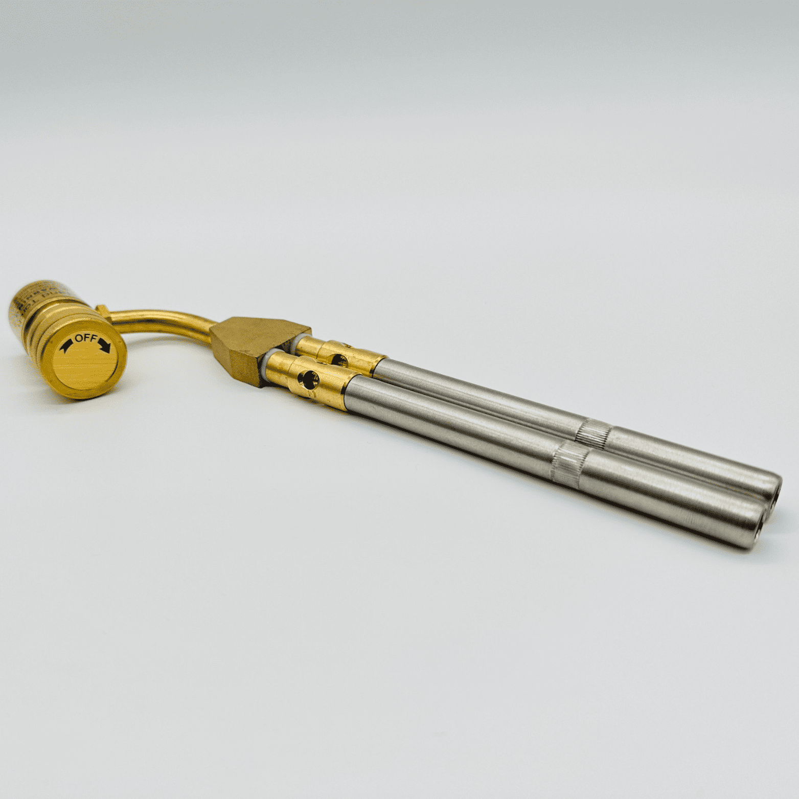 Twin torch burners with durable nickel-plated brass valve body, providing strength and high maximum working temperature. Easy turn tip swiveling 360° fine regulating valve for precise control. Fits both propane and MAP/Pro gas cylinders.